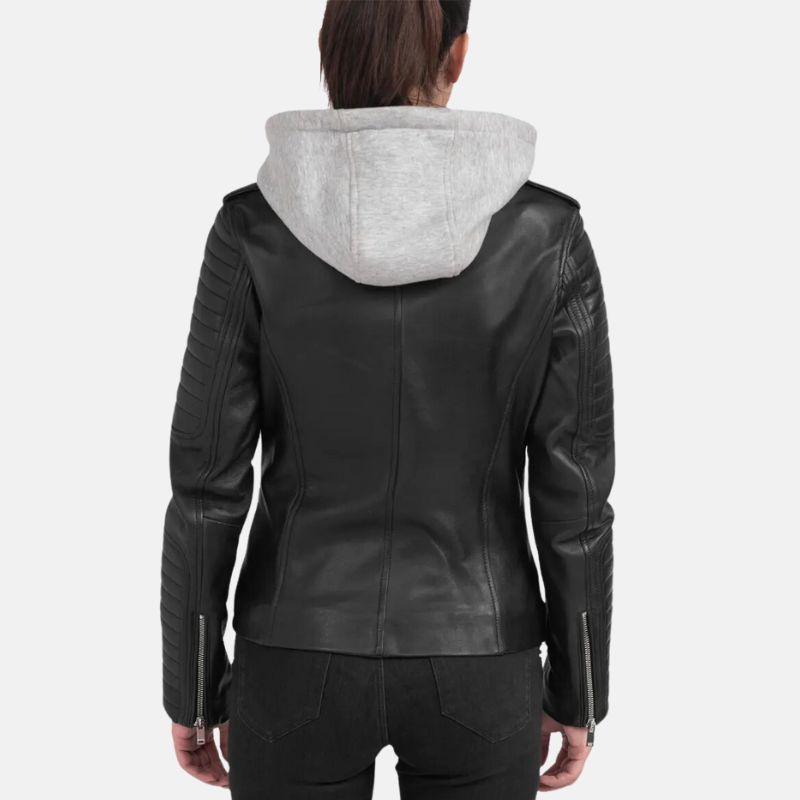 Womens Black Motorcycle Leather Jacket With Removable Hood